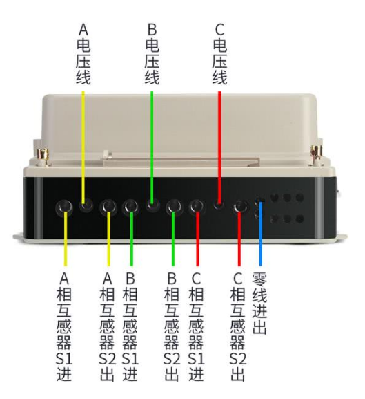 注意147和258之間沒(méi)有連接片,147分別接三個(gè)互感器的S1端,369接互感器的S2端,ABC三條火線從互感器的P1面穿過(guò),三個(gè)互感器的S2連一起接地。