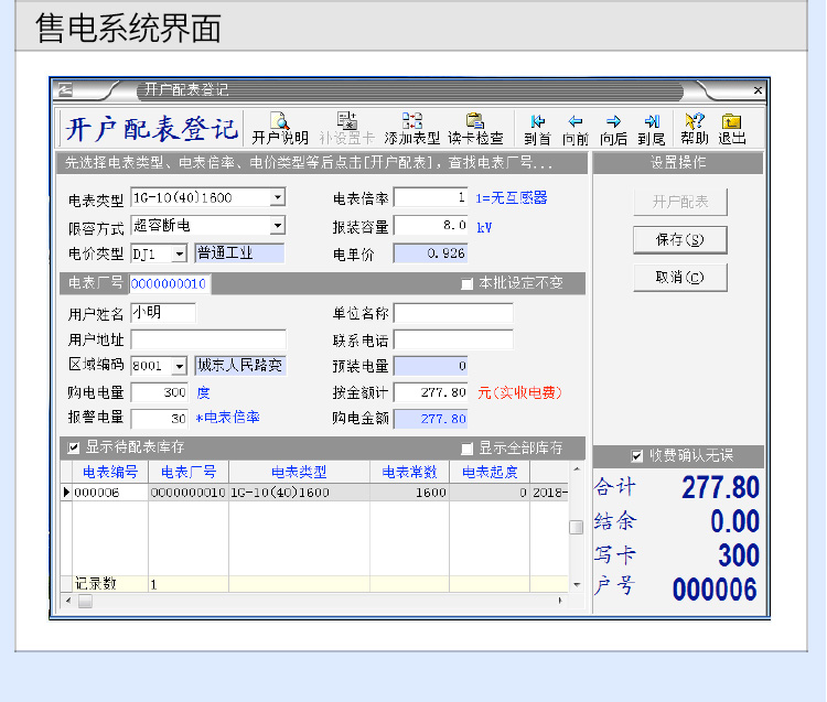 7、購(gòu)電方式:售電時(shí),將IC卡插入IC卡讀寫器,同時(shí)操作計(jì)算機(jī),將用戶編號(hào)、預(yù)購(gòu)電量、報(bào)警電量、限容方式及限容功率等加密寫入IC卡。
