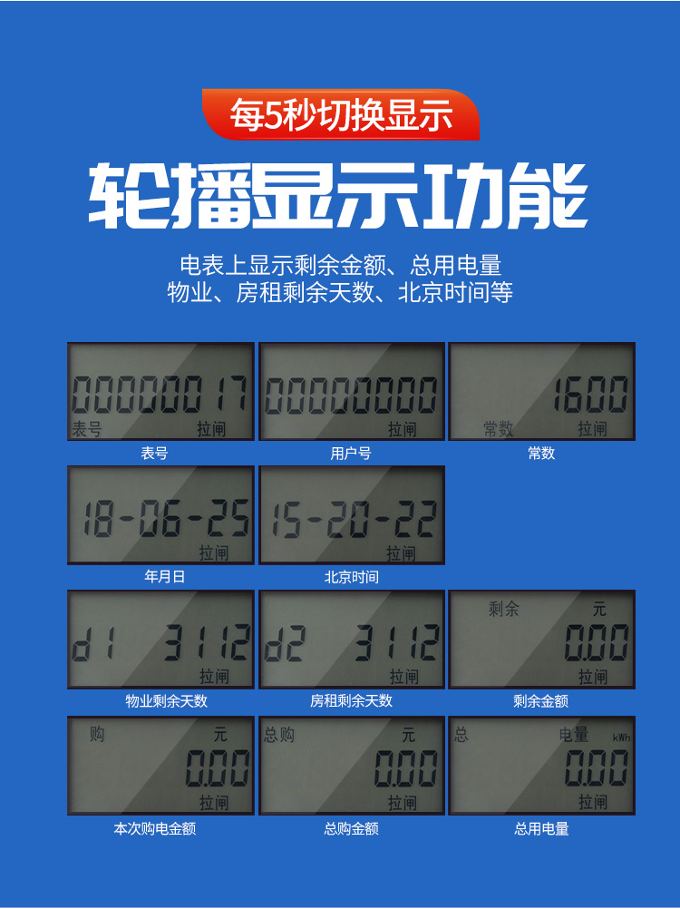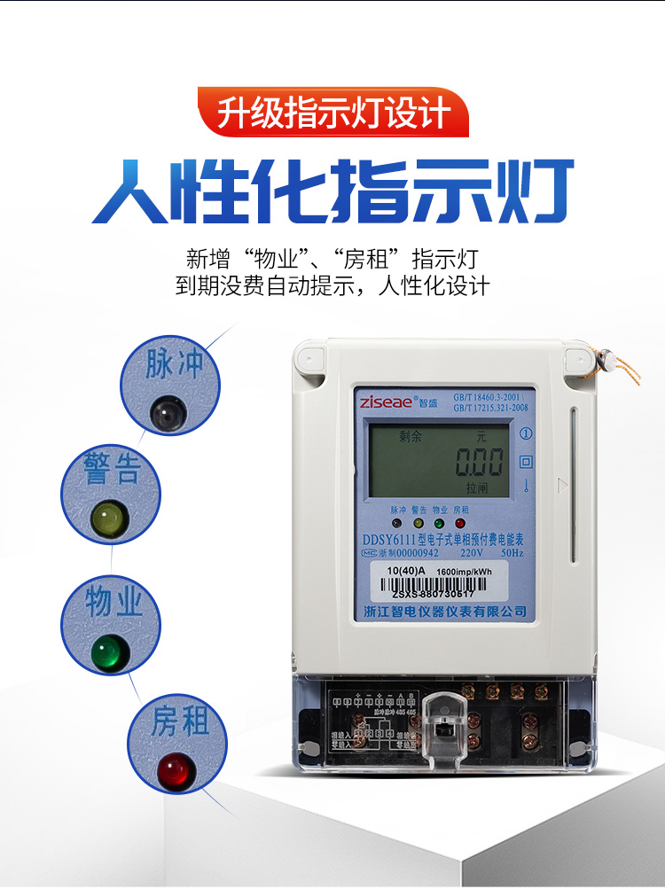 12、 預(yù)警提醒:當(dāng)表內(nèi)剩余電量小于“報(bào)警電量”的2倍時(shí),“報(bào)警指示燈”將閃爍(間隔為1秒)顯示提醒用戶購(gòu)電,此時(shí)如用戶插卡響應(yīng),“報(bào)警指示燈”閃爍間隔變?yōu)?秒,可以避免斷電警告。